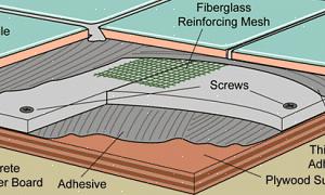 Standardinstallationen af en Tile-Redi brusebad af polyurethan starter med en indrammet bruseniche, der passer til brusebadet. Hvis undergulvet er træ, skal det modtage et lag cementplade for at beskytte træet mod mørtelbunden under panden.